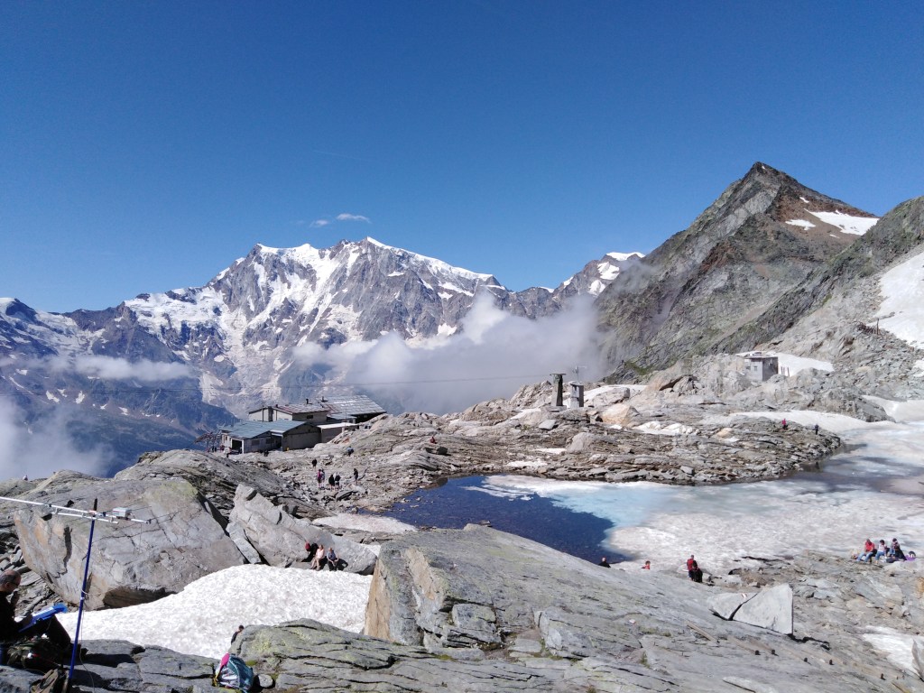 La parete est del Monte Rosa sullo sfondo dall’arrivo della funivia del Moro
